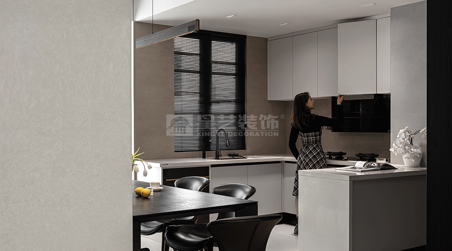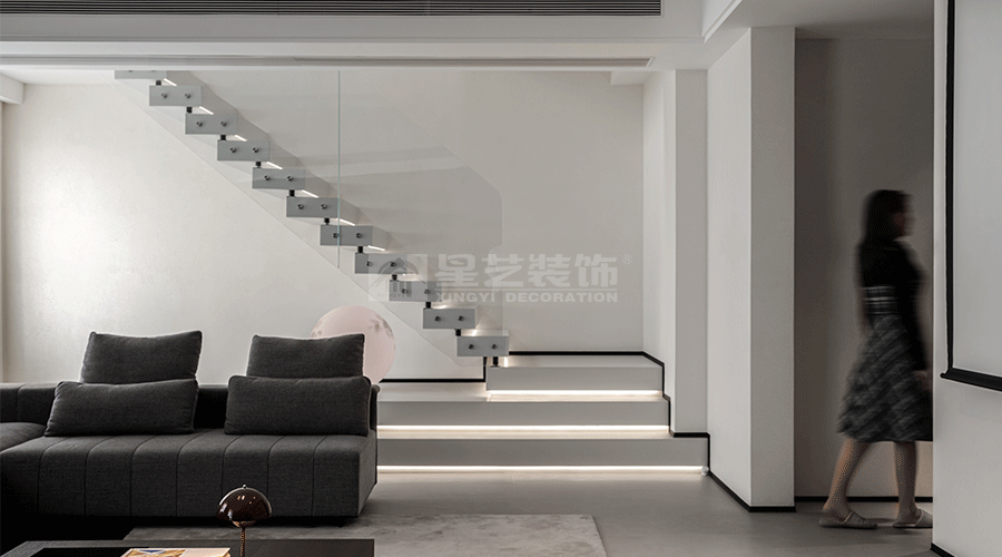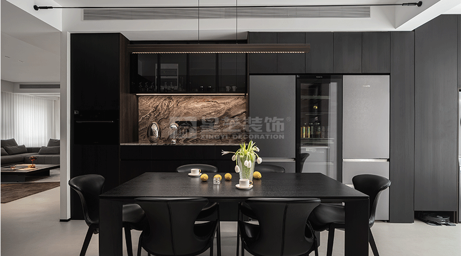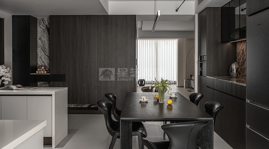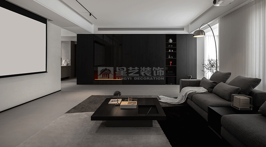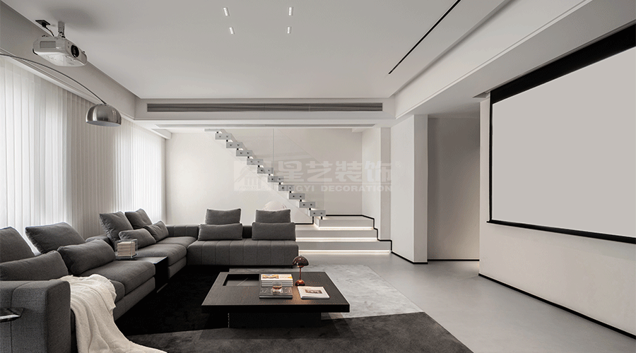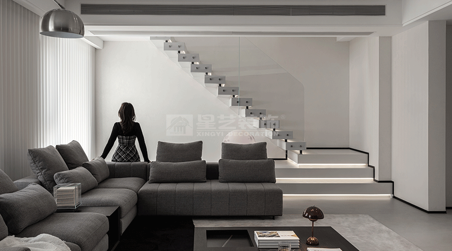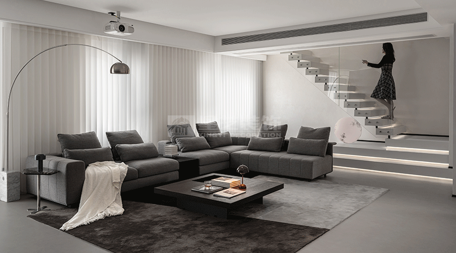 这套住宅设计秉持现代极简主义理念,以黑、白、灰为主色调,营造出高级且静谧的氛围。