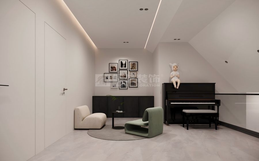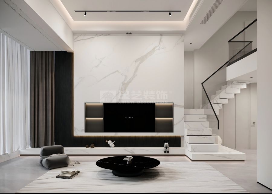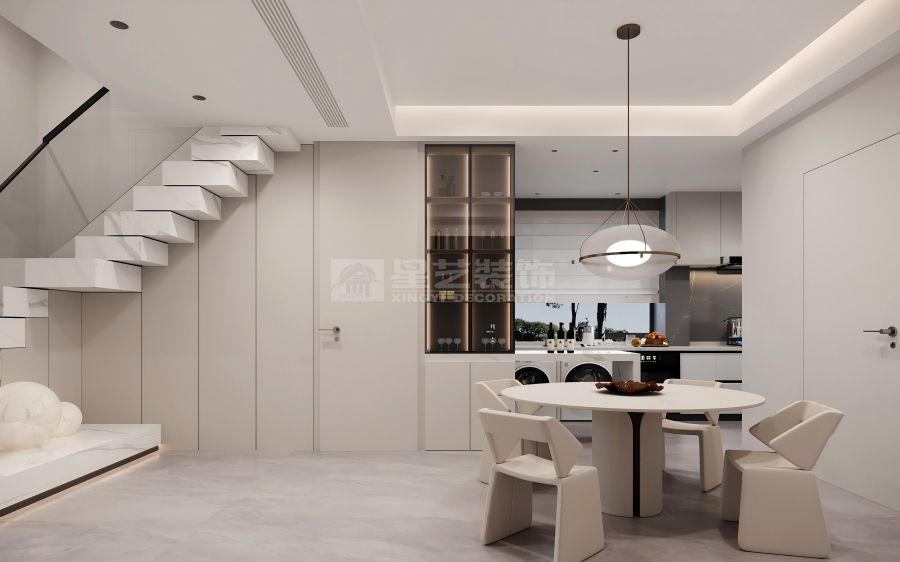 本案以现代简约风格设计,已白色加黑色木纹搭配,楼梯整体改造,原本占有餐厅空间,上楼方向变动