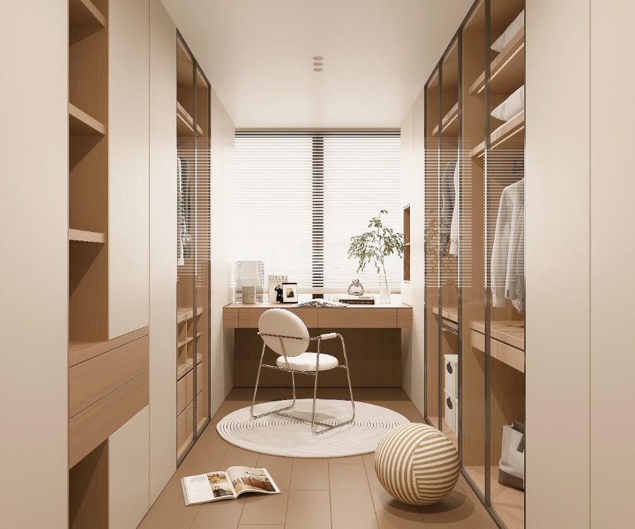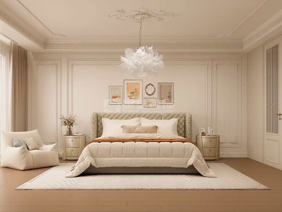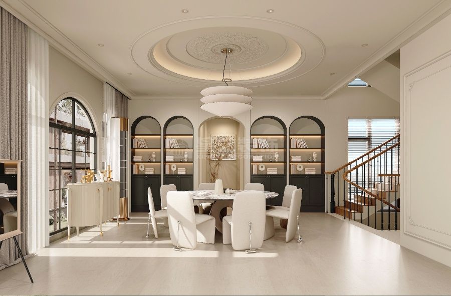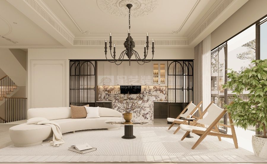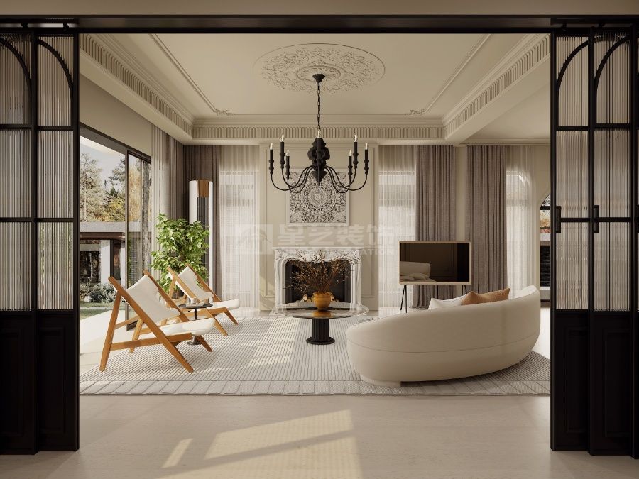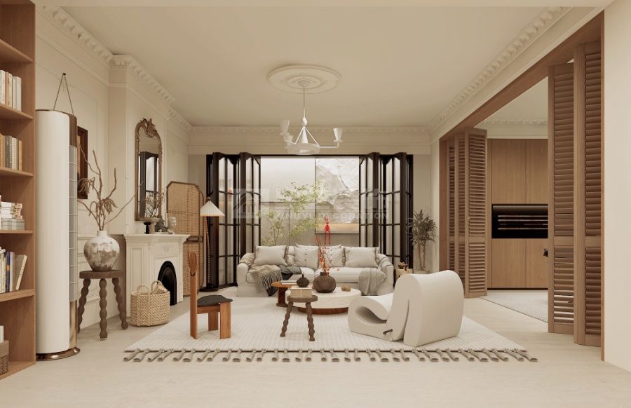 以 “复古轻调 + 自然松弛” 为核,古典檐饰衬现代软装,玻璃隔断引庭院景入室,旧韵与轻简交织,营造温柔有温度的复古栖居空间
