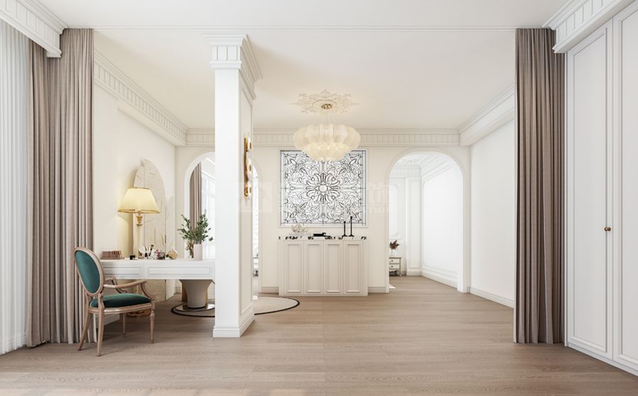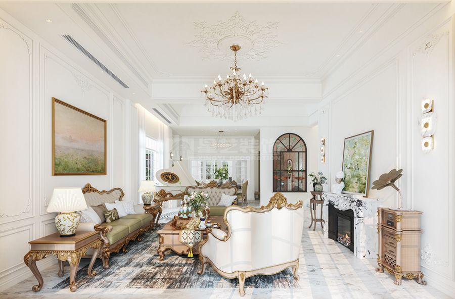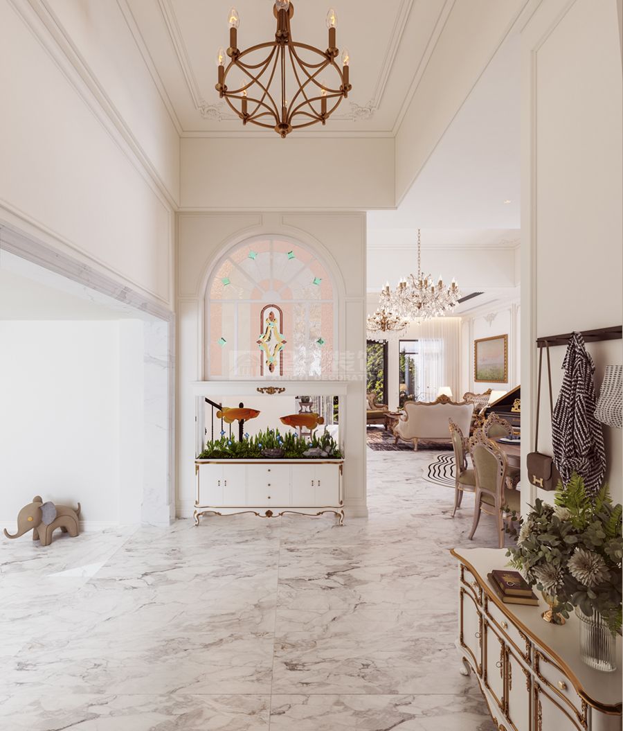 以宫殿气度打造玄关,精致鱼缸如镶嵌的宝石,金属雕花与水体波光折射奢华,游鱼为经典空间注入一抹灵动的现代诗意。