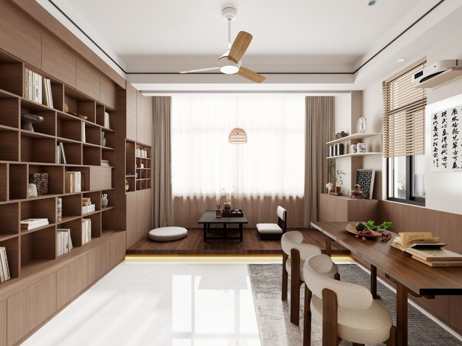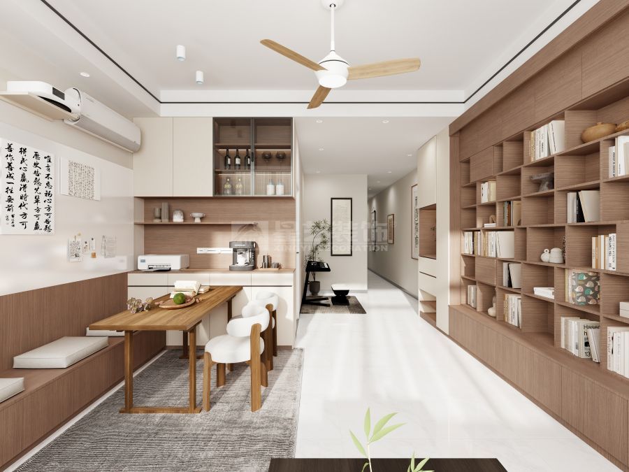 业主夫妻都是人民教师,有喝茶的习惯,在阳台区放置传统茶桌感觉不自在,那么绿意盎然的窗景也浪费,业主找到我的时候,我是带着解决方案上门沟通的,一番沟通,我帮业主规划了一个临窗的休闲地台,可喝茶,打坐,业主家里书籍多,也想培养小孩的阅读习惯,所以设计了满墙书柜,同时加个小心思,书柜最下面做深地柜,可以踩着地柜去拿书,同时还能兼顾投影幕布的位置,刚好鞋柜、幕布、地台齐平了,视觉上也舒服。这样客厅可休闲可会友,可一家人一起看影音,家人聚一起的时间多了。